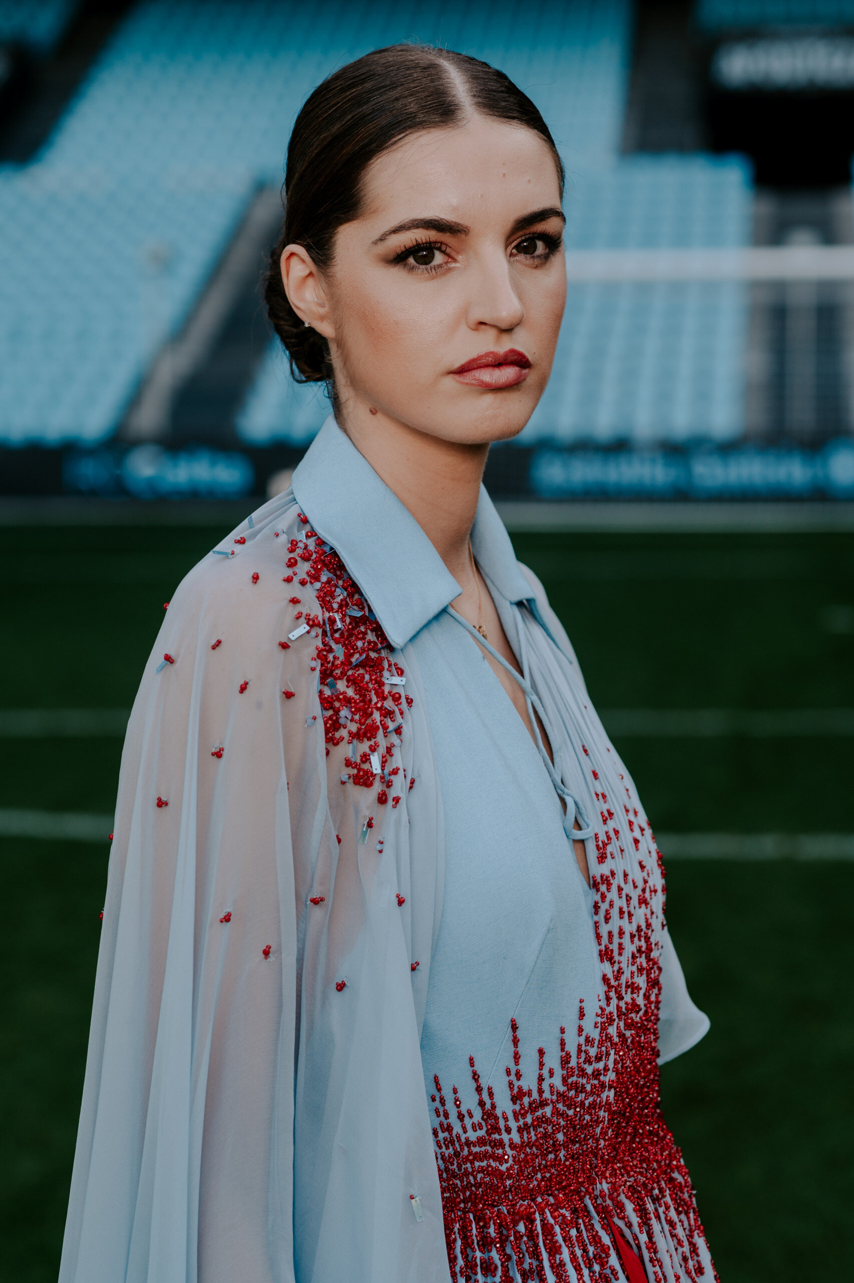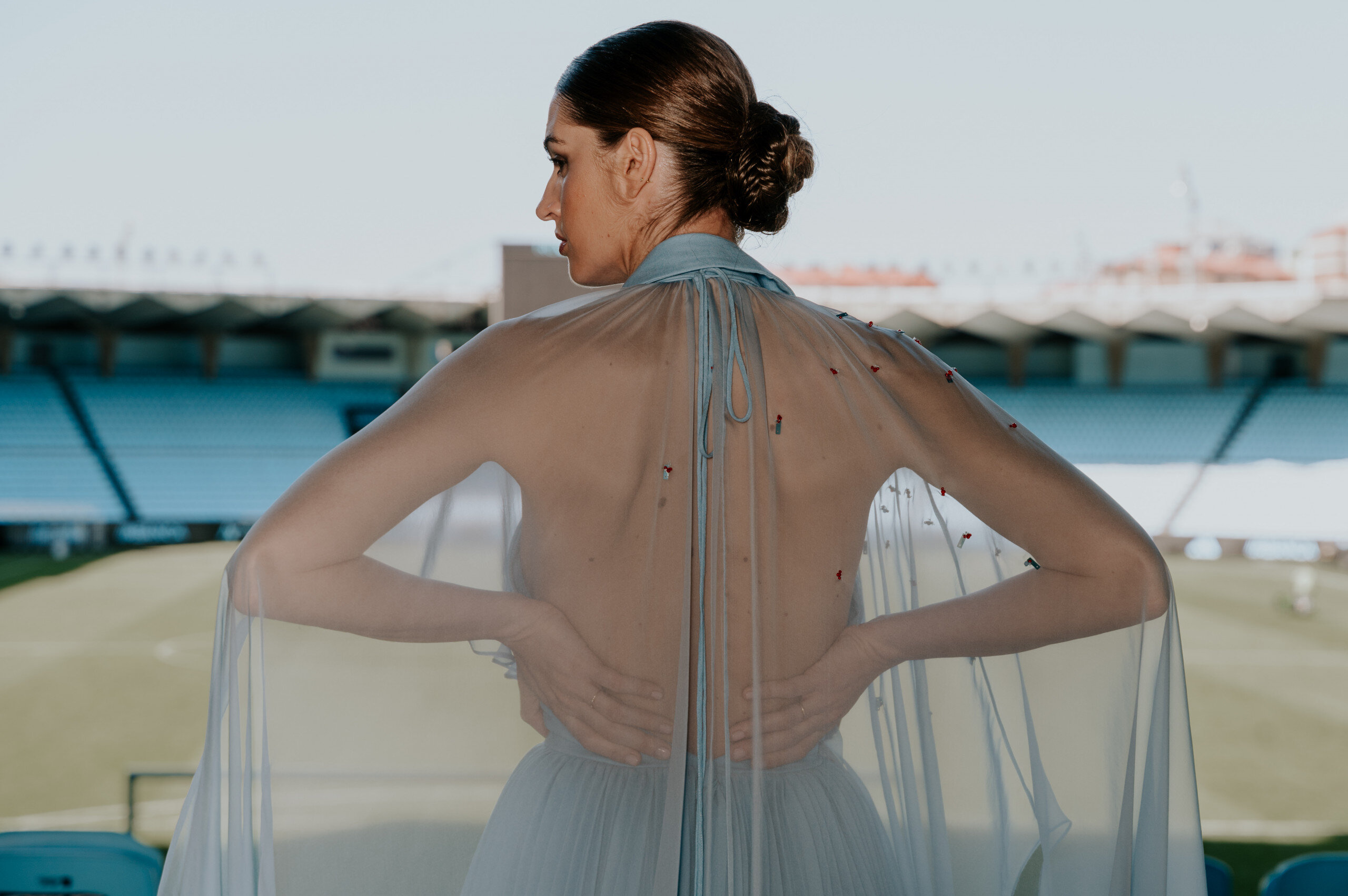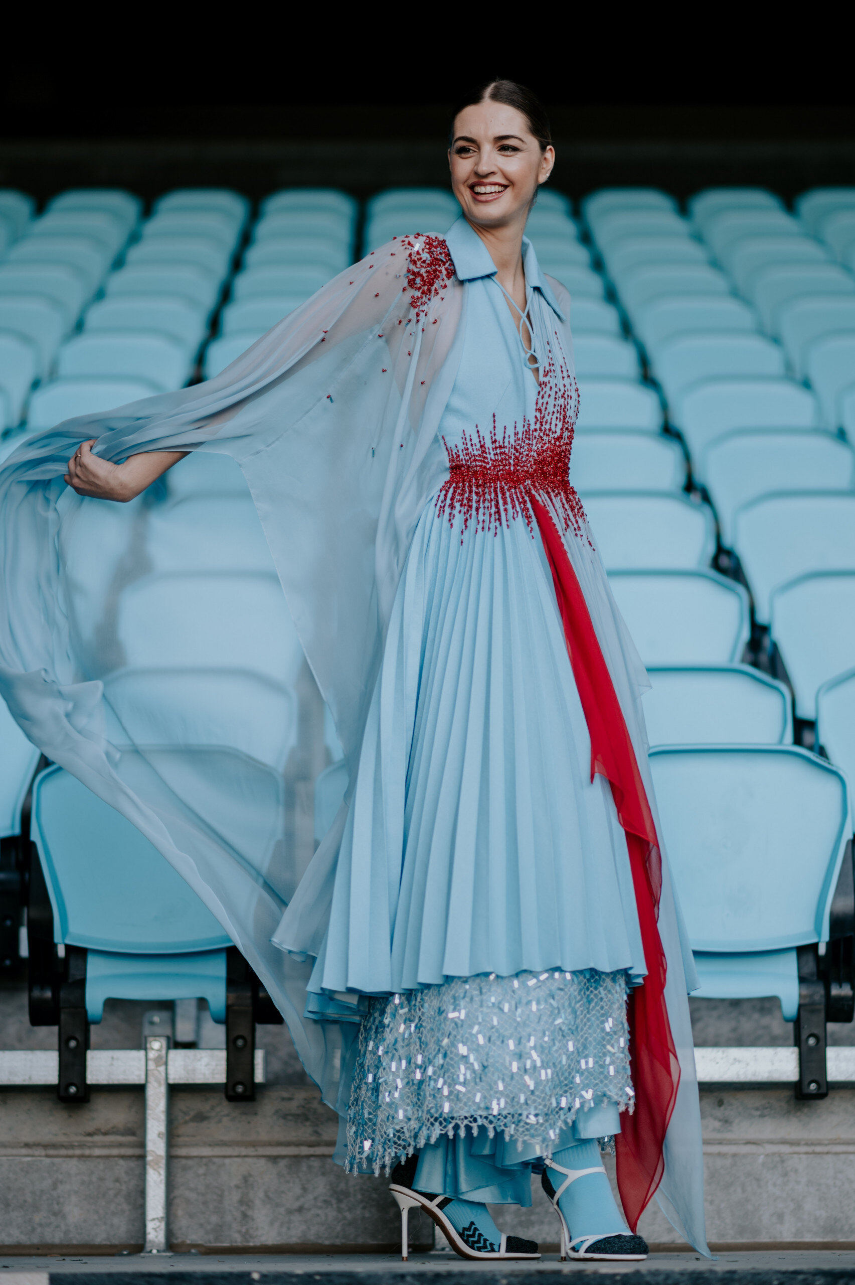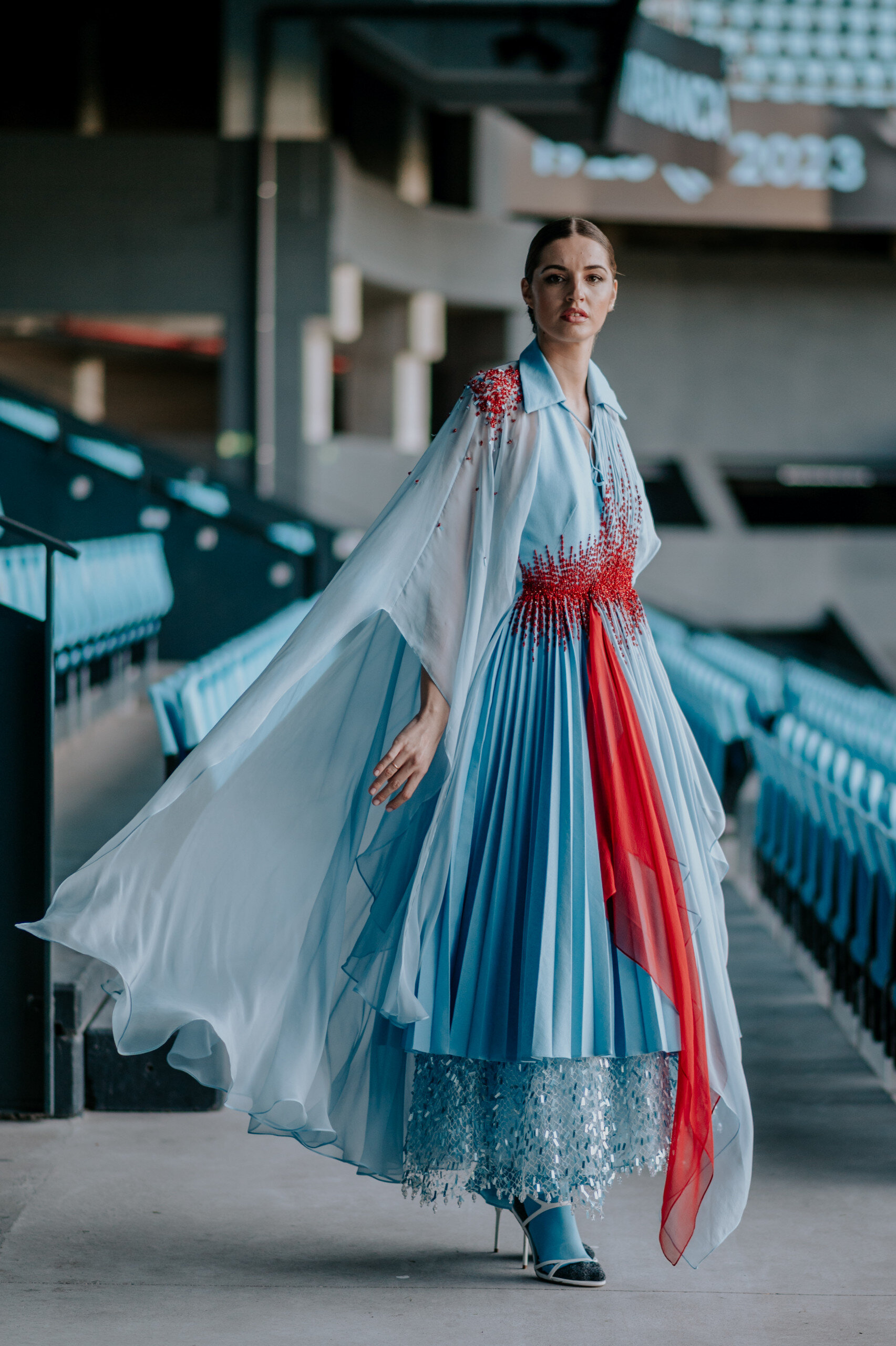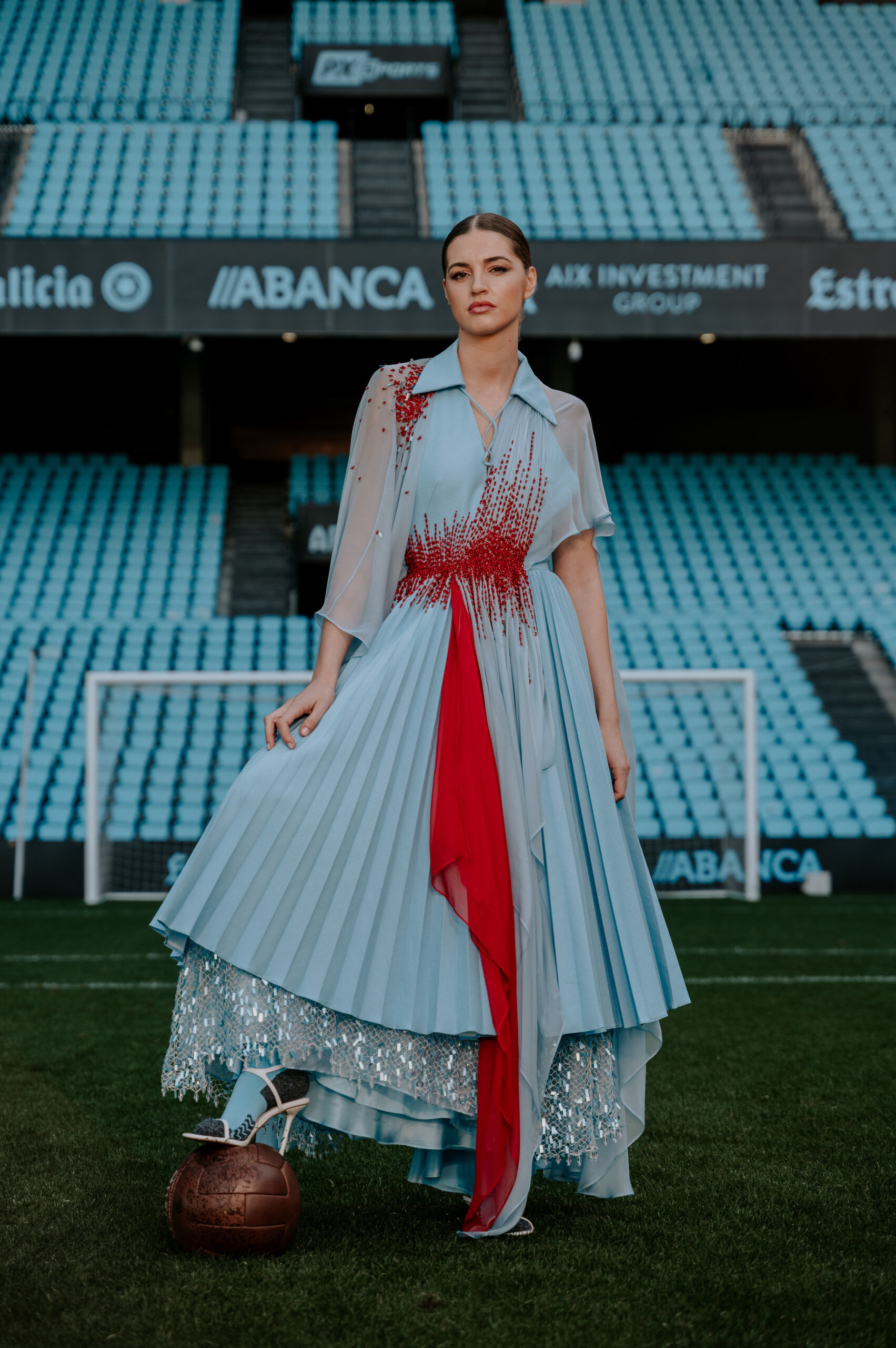 This authentic jewel was created by designer Isabel Núñez, who, with a family in Vigo and strong roots in Galician traditions, has been able to capture our history and origins through fashion. The rough fabric for its production was made of rustic silk, which symbolizes the nobility and authenticity that characterize us. Inspired by traditional Galician dress, Inuñez designed a layered skirt with pleats through the outer and inner layers finished with a hand-embroidered cotton mesh net in blue tones. This detail connects us with the sea and pays tribute to the hard work of so many Galician women who live for it. Furthermore, the neckline of the dress recreates the neckline of the first official Celta t-shirt, a spark of our origins. The most special touch of this creation is a spectacular crystal hand embroidery in vermilion tones, for which 100 hours of work were dedicated, one hour for each year of the club’s history. This detail symbolizes the flag that moves all Celticists and represents the flag that every Celta fan raises with pride, whether on a circle from Galicia or on a circle from part of the world.