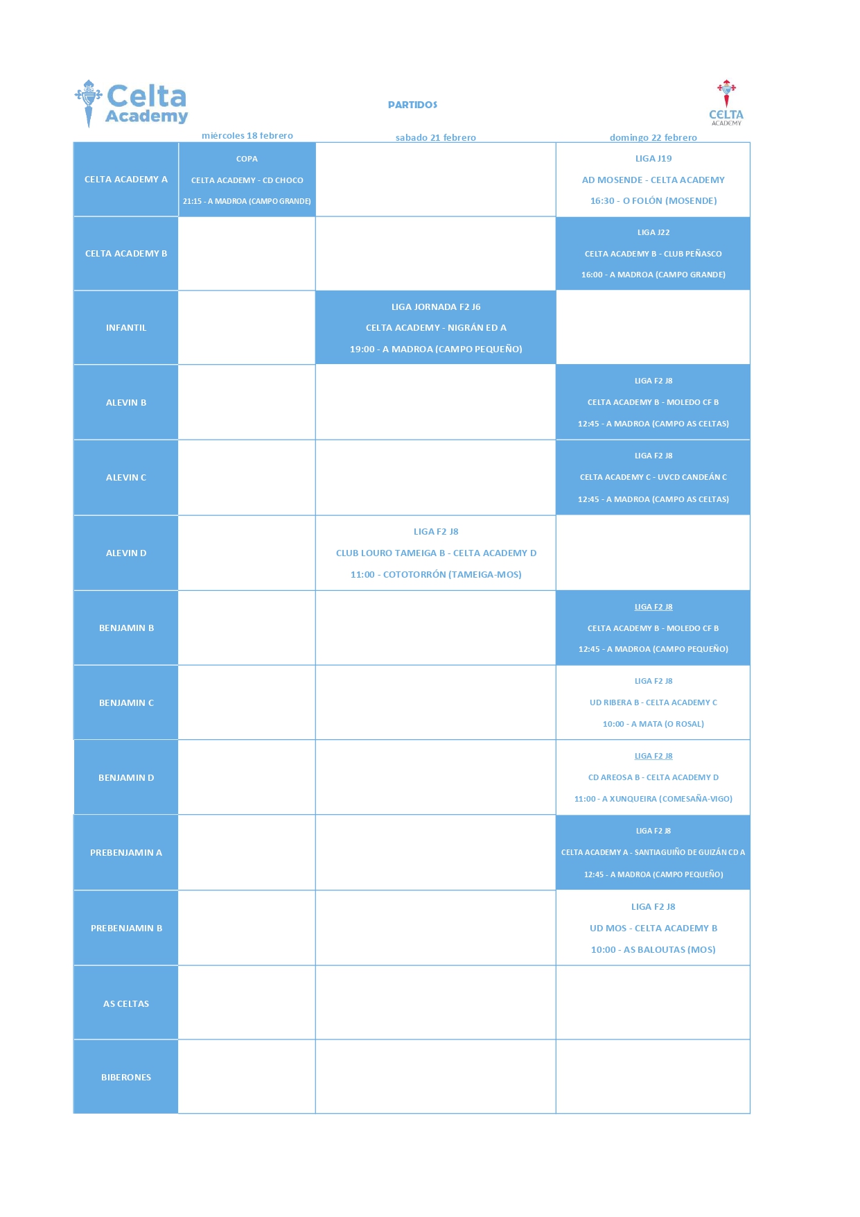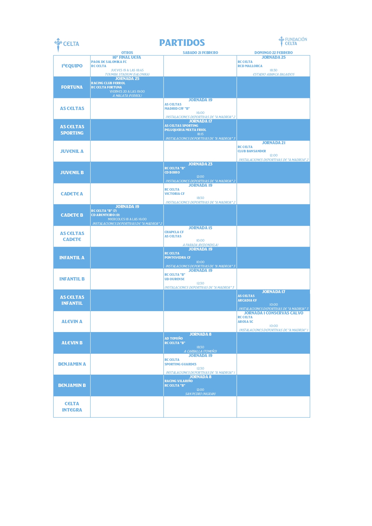 Horarios de A Canteira del Celta (21 y 22 de febrero)