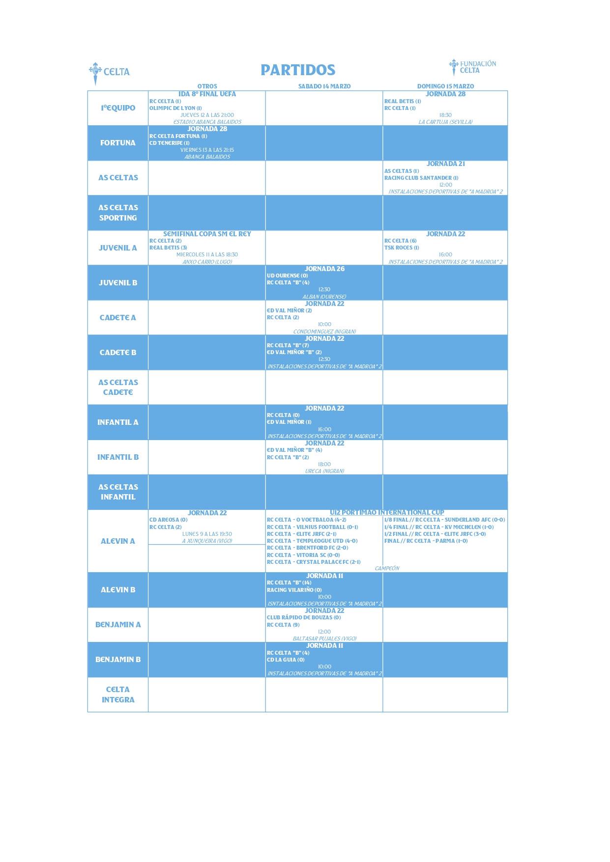 Resultados de A Canteira del Celta (14 y 15 de marzo)