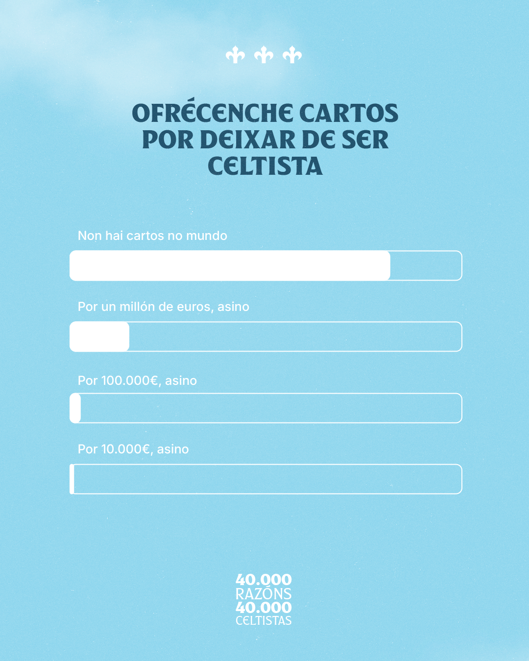 Entre todas as cuestións da enquisa, houbo unha que espertou especial atención. A pregunta sobre “Canto diñeiro faría falta para deixar de ser celtista?” atopou unha resposta case unánime. O 81,6% afirmou que non existe cantidade capaz de distancialos do equipo. Aínda que un 15% recoñeceu que, por un millón de euros, polo menos pensaríao.