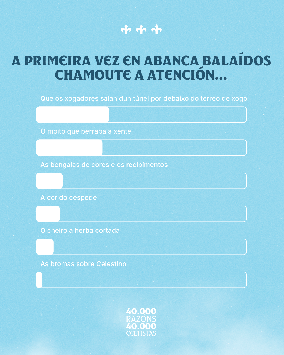 A esta memoria súmase outro elemento que axuda a explicar a identidade celeste. As camisetas, a segunda pel de cada celtista, segue sendo o obxecto máis prezado. Cunha media de cinco por afeccionado, estas pezas gárdanse como auténticos tesouros. Un sentimento que leva por fóra, pero tamén por dentro; xa que aparece tamén cando os enquisados falan de como se definen a si mesmos. Case a metade sitúa “ser do Celta” entre as tres características que mellor os representan, o que demostra o peso que esta paixón ten na súa vida diaria. Unha identidade que se empeza a construír desde a primeira vez que pisan Abanca Balaídos. E, precisamente, as primeiras impresións no templo celeste foron outro dos aspectos destacados. A moitos lles sorprendeu a saída dos xogadores desde o túnel situado baixo o terreo de xogo e a forza coa que a bancada animaba ao equipo.