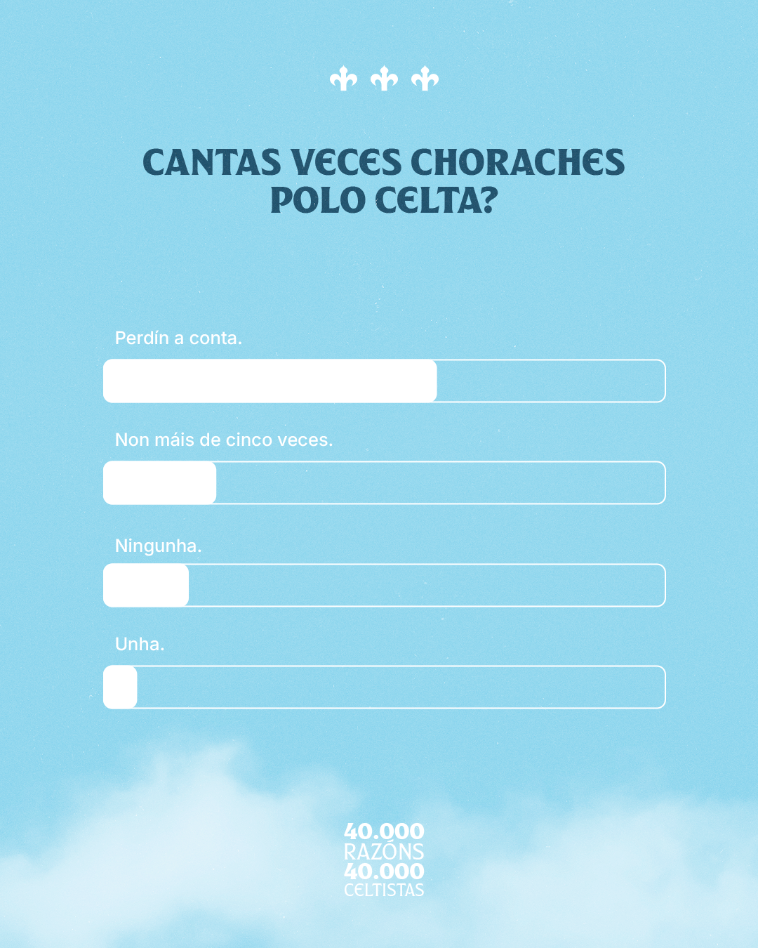 Como cabía esperar, a maioría dos afeccionados descubriu a súa paixón polo Celta grazas aos seus pais e nais, e moitos seguen compartindo con eles este sentimento que, aínda que bonito, tamén está inevitablemente ligado ao sufrimento. O 60% dos enquisados recoñece perder a conta das veces que chorou polo equipo, pero nin un só deses momentos foi razón suficiente para exporse non renovar o seu carné.