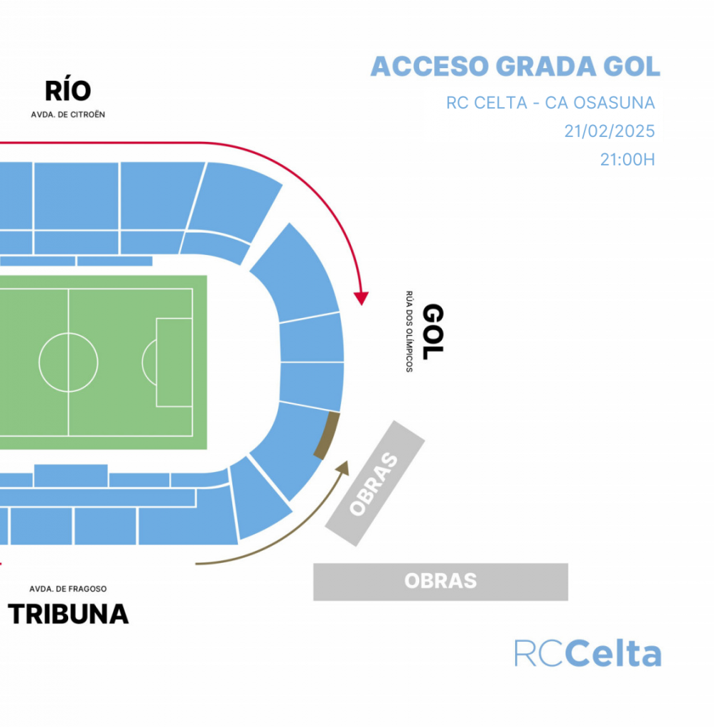Debido aos traballos previos que se están realizando para a nova bancada de Gol, a Rúa dos Olímpicos terá un acceso uy limitado. Recoméndase por tanto a todos os abonados que entren polas portas de Gol accedan desde a Avenida Citroën.