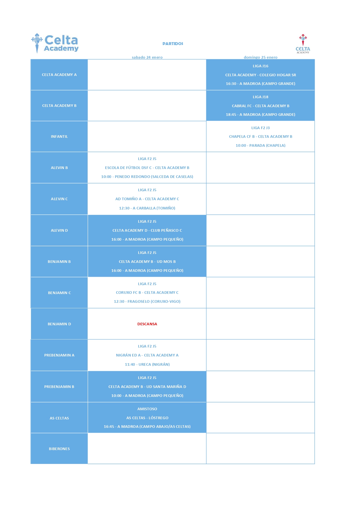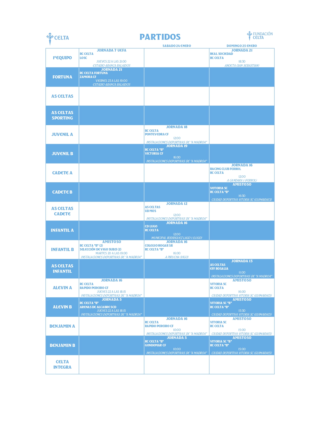 Horarios de A Canteira do Celta (24 e 25 de xaneiro)