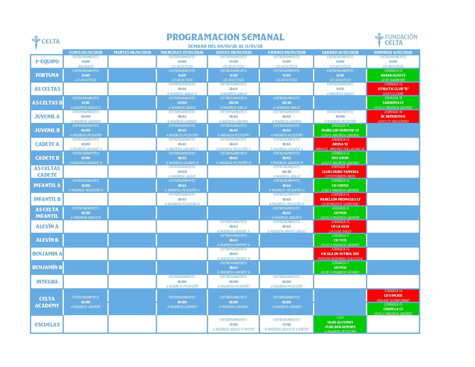 Programación de A Canteira do Celta (do 5 ao 11 de xaneiro)